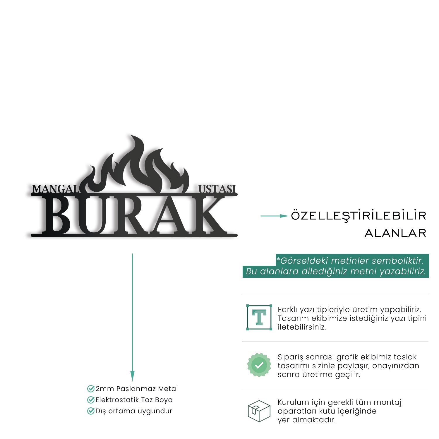 Kişiye özel tasarımıyla barbekü keyfinizi ve ateşin sıcaklığını yaşam alanlarınıza taşıyan bu metal isimlik, bahçe ve barbekü alanlarınıza eşsiz bir stil kazandırır. Şık ateş figürü ve modern tasarımıyla, hem dekoratif hem de işlevsel bir ürün sunar.