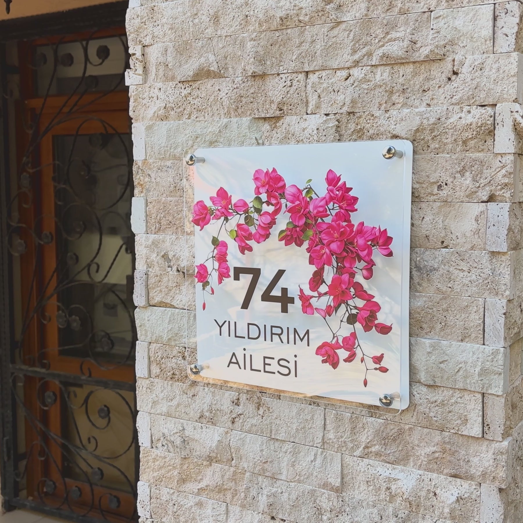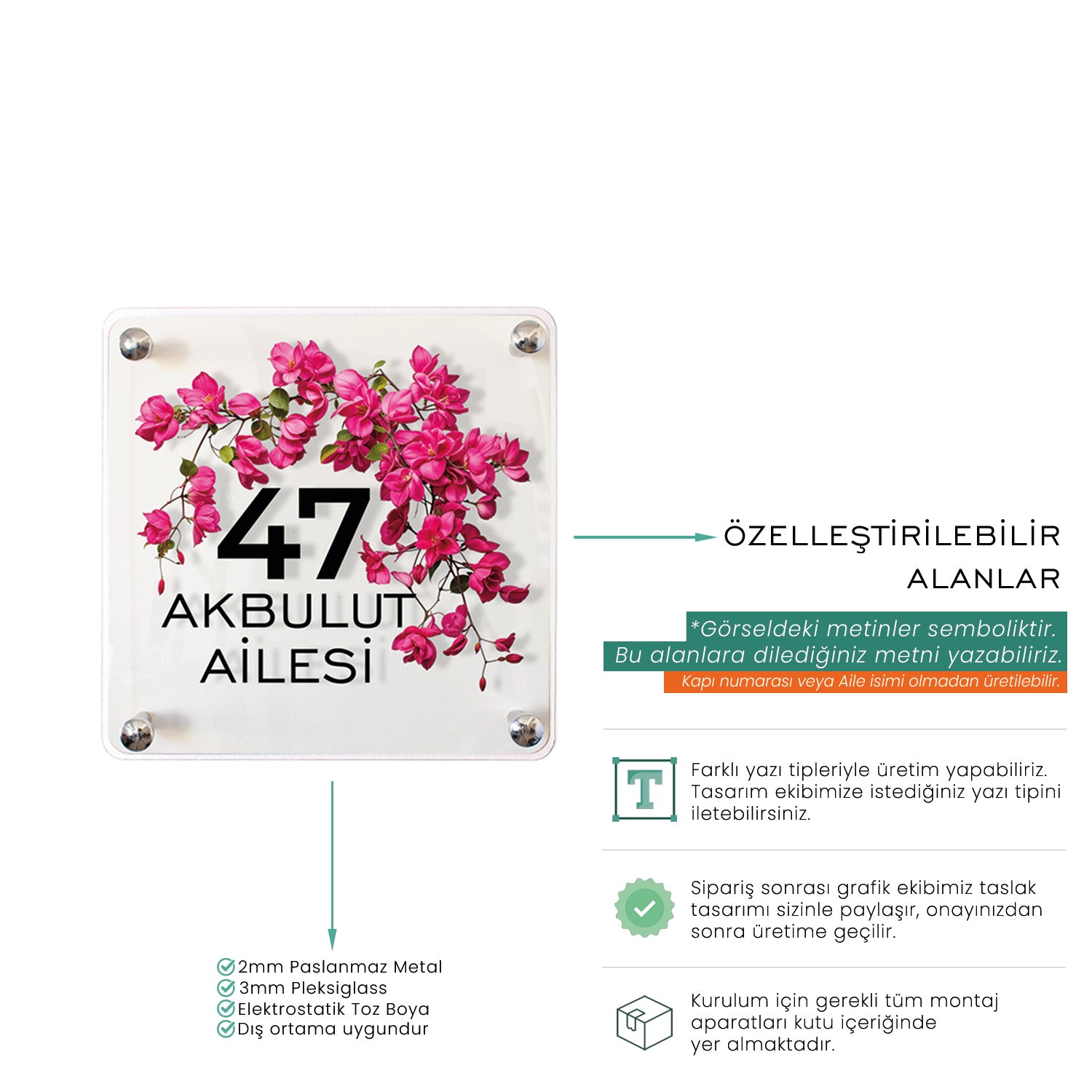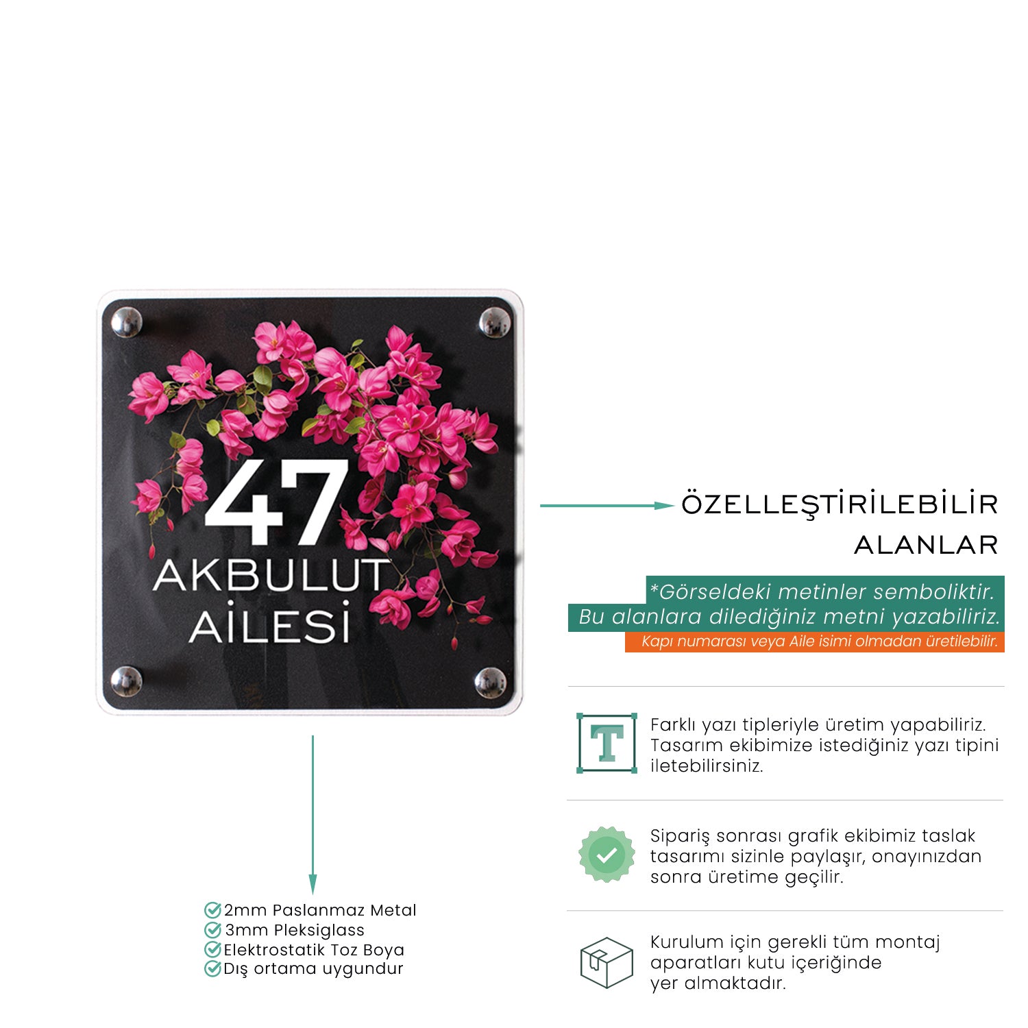 Evinizin girişine kişisel bir dokunuş katın! Siyah zemin üzerinde fuşya tonlarında çiçeklerle süslenmiş bu özel tasarım kapı tabelası, dilediğiniz kapı numarası ve aile ismiyle kişiselleştirilerek hazırlanır. Arka yüzeyi dayanıklı metal, ön yüzeyi ise parlak pleksiglastan oluşur. UV baskı teknolojisi sayesinde canlı renkler uzun süre solmaz. Hem siyah hem beyaz zemin alternatifleriyle her kapıya uyum sağlar.