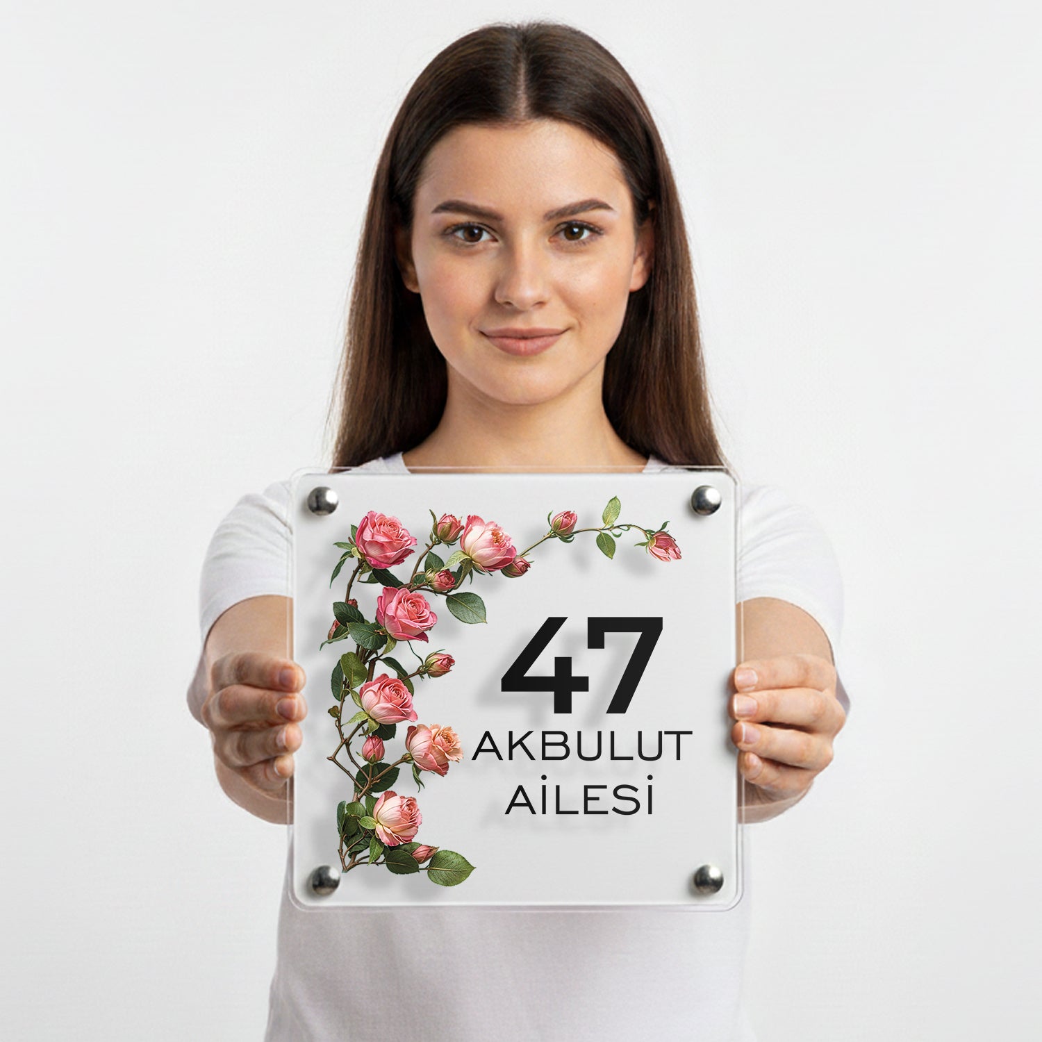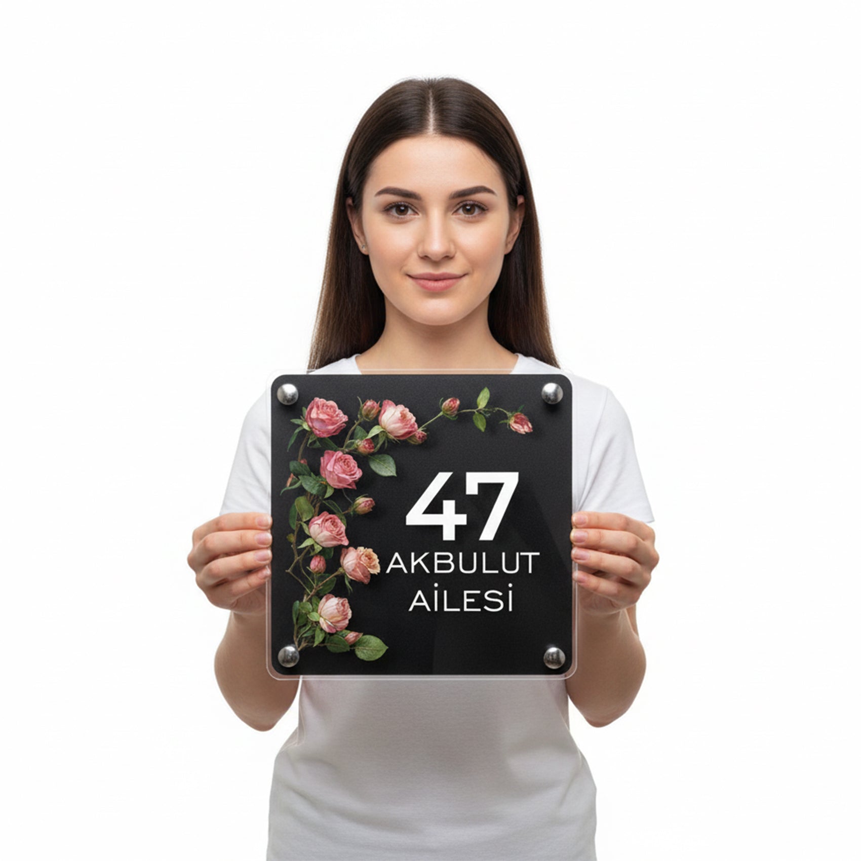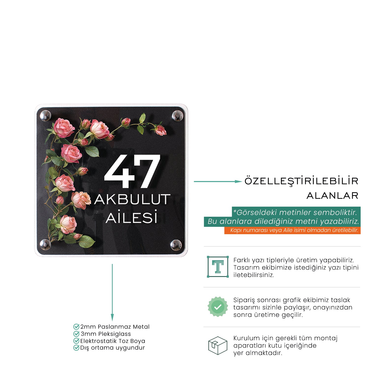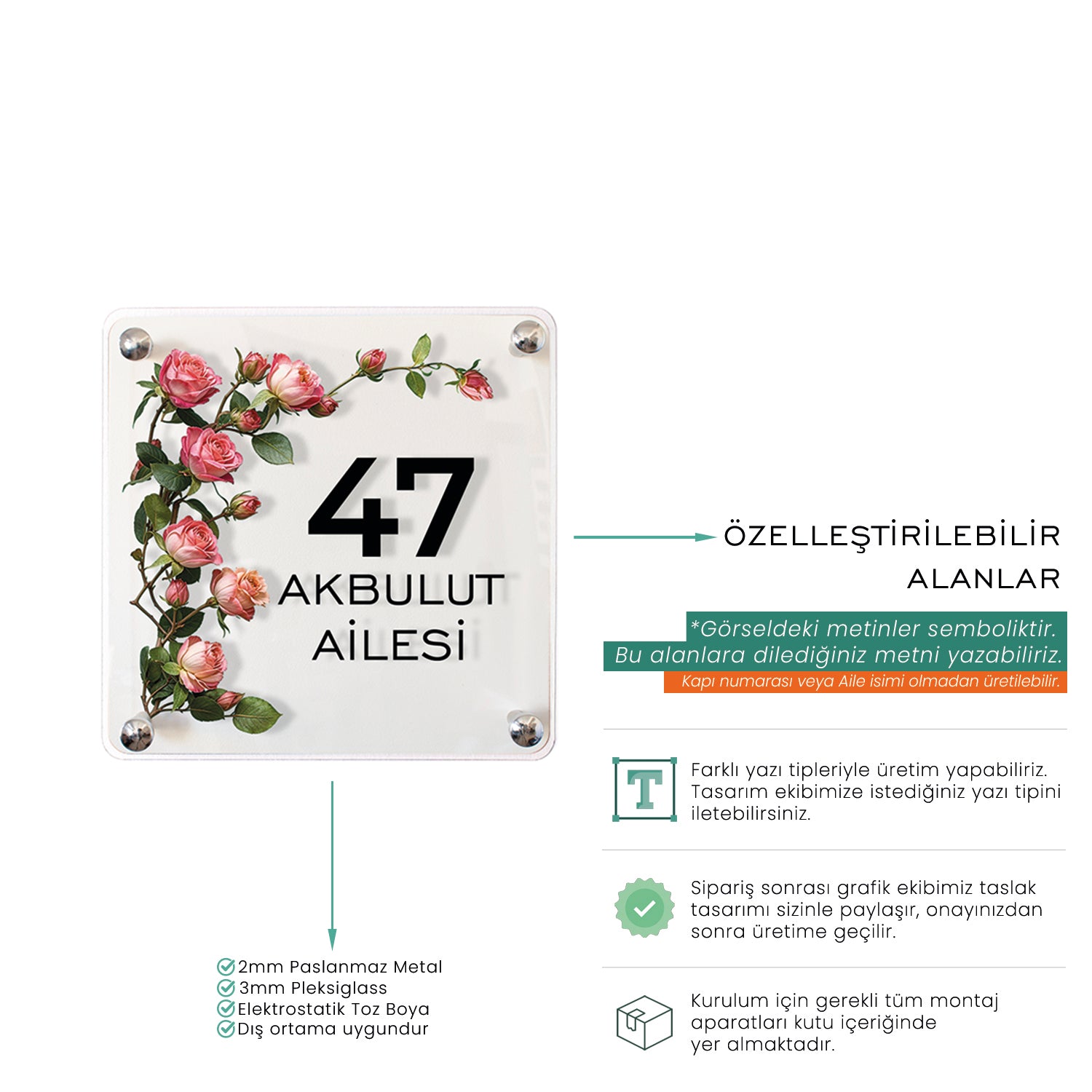 Evinizin girişine kişisel bir dokunuş katın! Sol kenardan sarkan pembe gül dallarıyla dikkat çeken bu özel tasarım kapı tabelası, dilediğiniz kapı numarası ve aile ismiyle kişiselleştirilerek hazırlanır. Arka yüzeyi dayanıklı metal, ön yüzeyi ise parlak pleksiglastan oluşur. UV baskı teknolojisi sayesinde canlı renkler uzun süre solmaz. Hem siyah hem beyaz zemin alternatifleriyle her kapıya uyum sağlar.