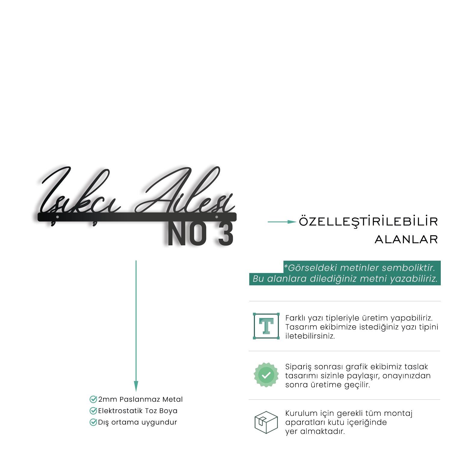 Villanızı benzersiz kılmak ve girişinize zarif bir dokunuş eklemek için tasarlanmış bu Kişiye Özel İsimlik, evinizi sıcak ve davetkar bir şekilde karşılamak için mükemmel bir seçenektir. Minimalist metal tasarımı, villanızın kapısında veya girişinde hoş bir detay oluştururken, el yazısı estetiğiyle kişisel bir hava katmaktadır.