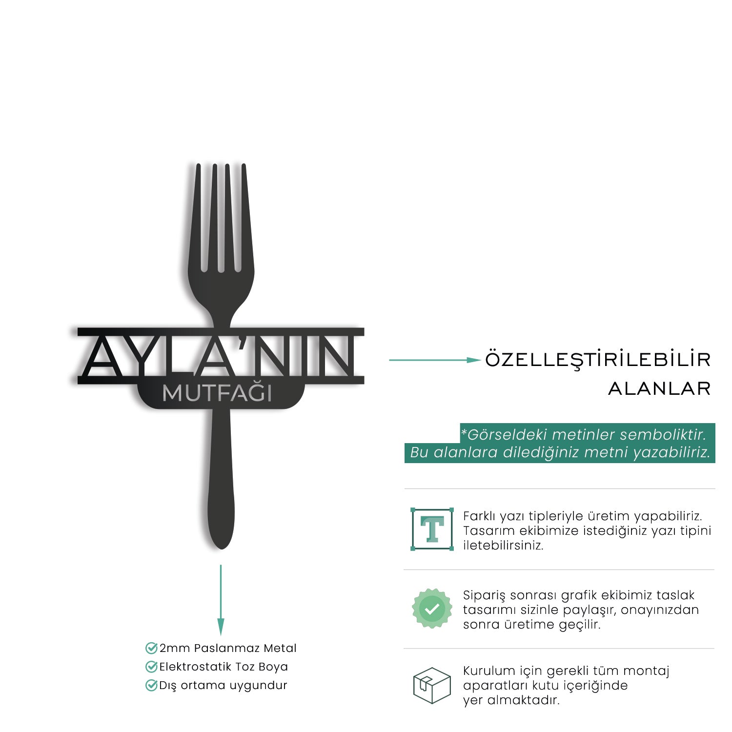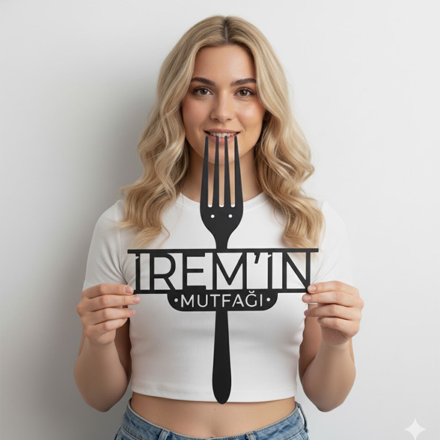 Kişiye Özel Mutfak İsimliği, mutfaklarına özel bir dokunuş katmak isteyenlere özel tasarlanmış benzersiz bir metal duvar dekoru. Çatal üzerinde bulunan kişiye özel isim detayı, ev mutfaklarına, cafe ve restoran mutfaklarına sıcaklık ve özgünlük katıyor. Bu özel ürün, mutfakta vakit geçirmeyi seven eşlere, annelere özel bir hediye alternatifi sunuyor.