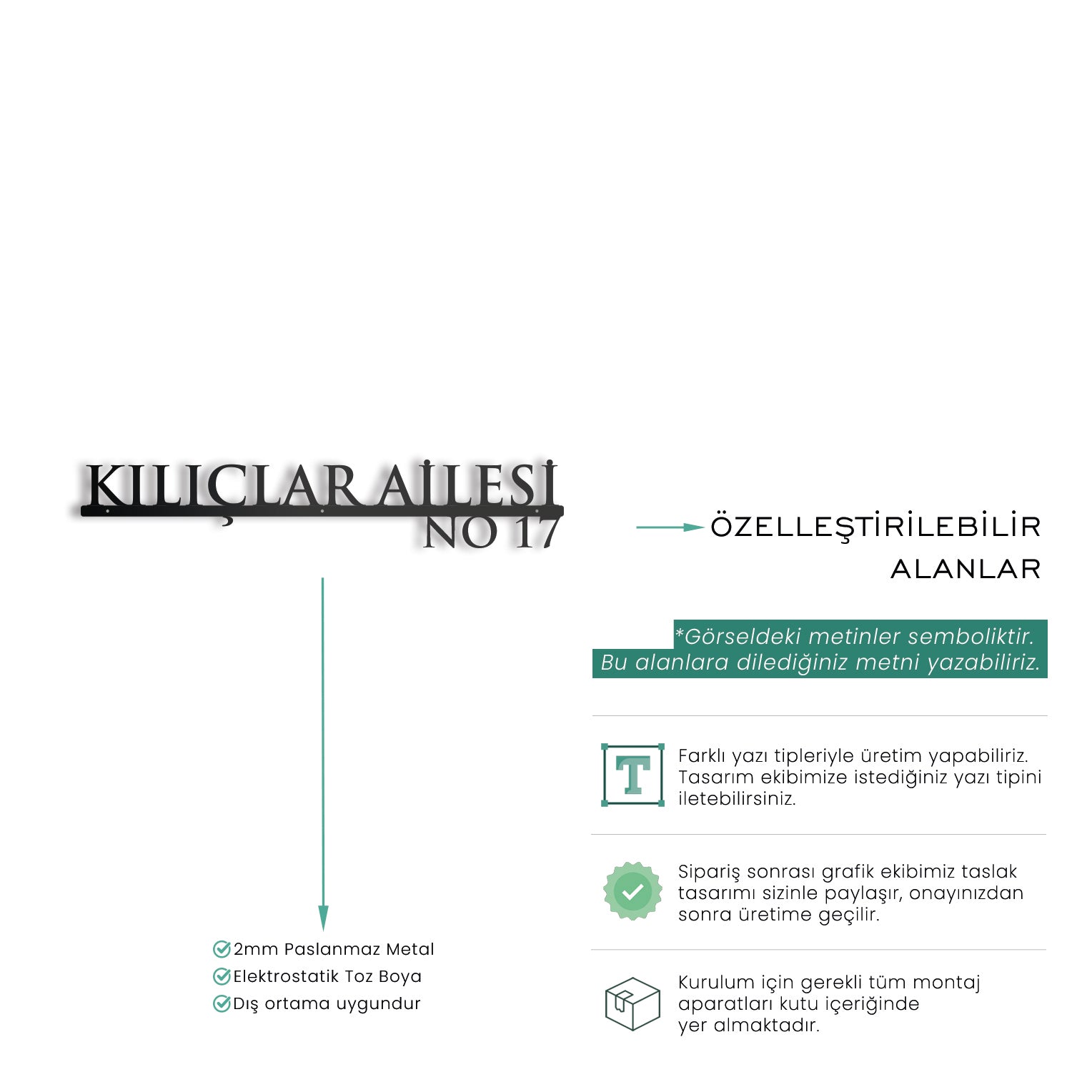 Bu adres tabelası, modern çizgileri ve kişiselleştirilebilir detaylarıyla fark yaratır. İsim ve adres bilgilerinizi ekleyerek evinizin stilini yansıtabilirsiniz. Şıklığı ve dayanıklılığı bir arada sunar.